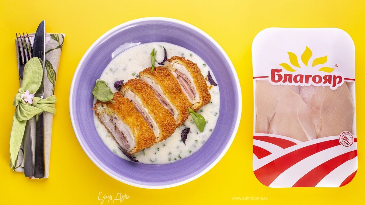 На одну сторону филе грудки выложите полоску ветчины, затем сыр и сверху еще одну полоску ветчины. - Шаг 7