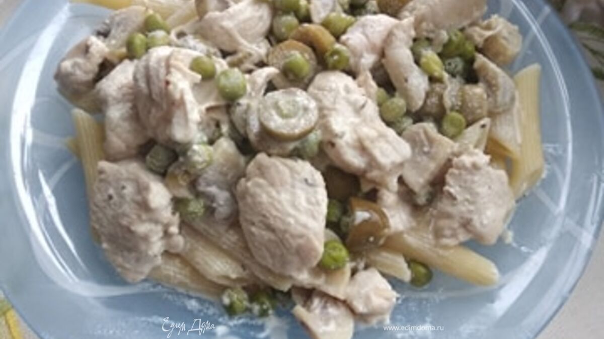 В сковороде или сотейнике разогреть растительное масло. Обжарить курицу до румяной корочки. Добавить шампиньоны. Обжаривать вместе минут 5. Влить сливки. Если вы используете замороженный горошек, добавить его в тот момент, когда сливки почти закипели. Если используете консервированный, тогда — в последний момент. Потушить на медленном огне до готовности курицы (минут 15). Добавить оливки. Посолить и поперчить по вкусу. Когда оливки прогреются, снять с огня. Подавать с любимым гарниром. Приятного аппетита!