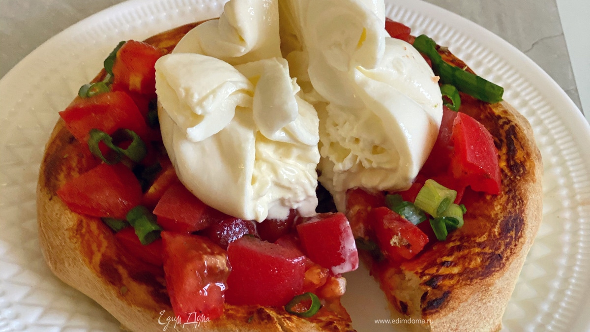 Это очень вкусно, за основу взято тесто для пиццы. Спелые томаты и буррата — отдельное удовольствие.