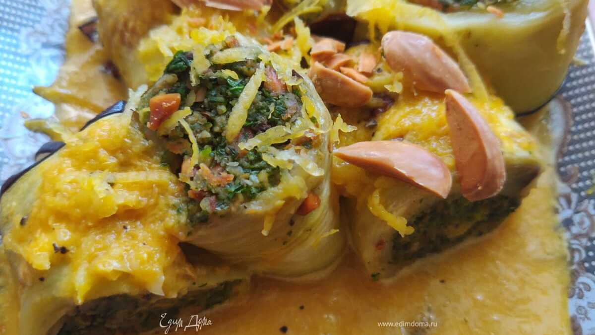 - Шаг 1Баклажаны нарезать пластинками вдоль. Разложить на противне, используя пекарскую бумагу, и сбрызнуть оливковым маслом. Запекать при 200°C около 20 минут. Смотрите по своей духовке, баклажаны должны быть золотистого цвета.