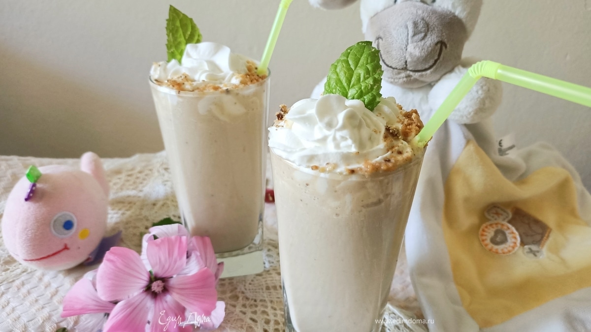 Измельчаем все до однородности. Готовый смузи разливаем по стаканам, сверху украшаем взбитыми сливками и посыпаем печеньем. Банановый смузи готов! Приятного аппетита!