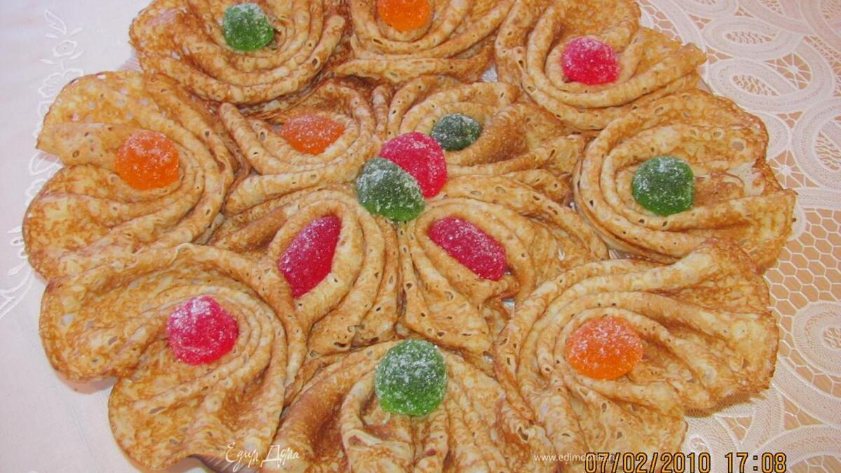 - Шаг 1Молоко + вода +сахар, соль – подогреть. 1/4 часть смеси отлить. Взбить яйца, добавить в молоко, просеять муку и соединить со смесью. Все взбить венчиком, добавить соду, раст.масло(теплое). Если смесь густая добавить оставшееся молоко. Сковороду смазать растительным маслом , сильно разогреть и выпекать блины на среднем огне. Каждый блин смазать сливочным маслом. Начинка : любая. Украсила мармеладом.