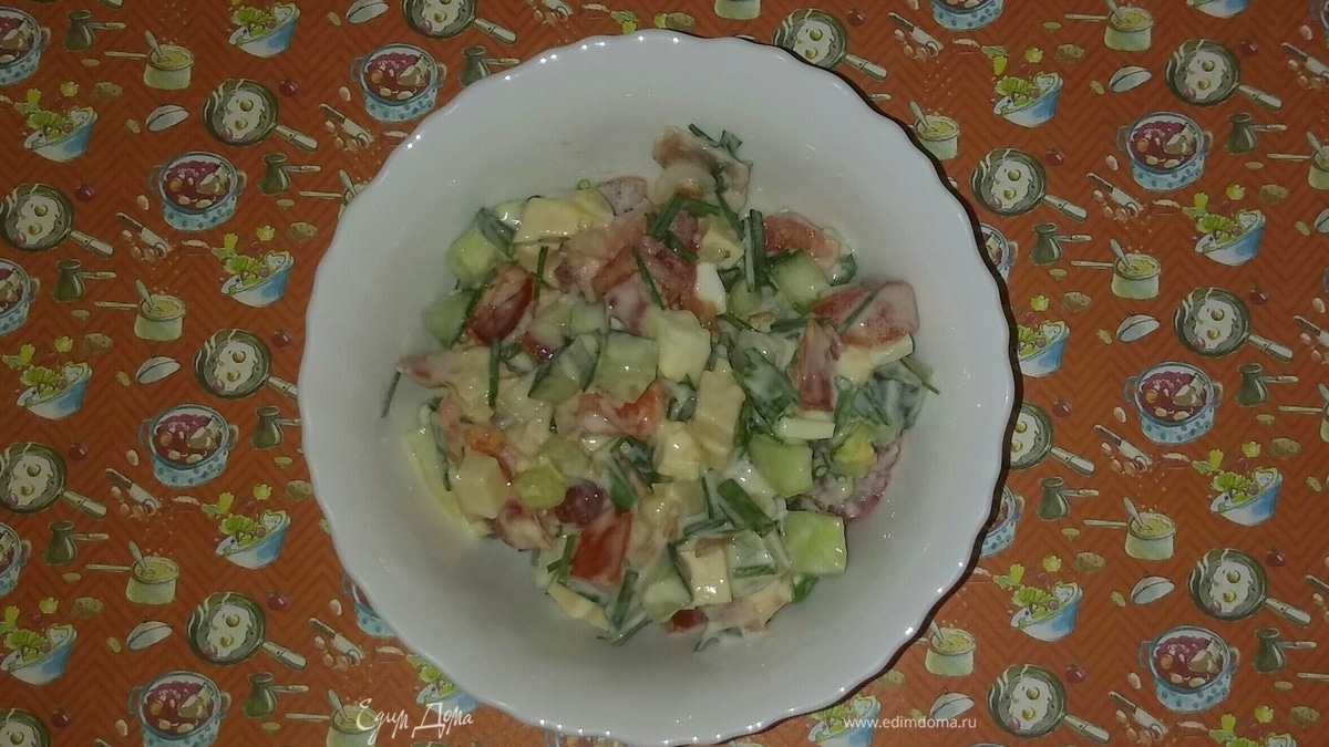 Во время летнего отдыха на даче появляются новые интересные рецепты салатов. На нашей даче этот салат готовится с одной важной особенностью — это способ нарезки. Нарезать все ингредиенты нужно мелким кубиком, так как от этого зависит вкус блюда.