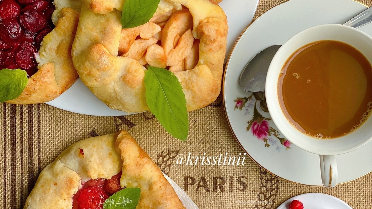 Фрукты или ягоды тщательно вымыть и обсушить. Муку смешать с разрыхлителем. Творог растереть с размягченным сливочным маслом и щепоткой соли. Добавить муку, замесить тесто. Сформировать шар, накрыть пленкой и убрать в холодильник на 30 минут. Ягоды или фрукты нарезать. Я делала несколько маленьких галет, вы можете сделать две большие. Разделите тесто на равное количество кусочков (от двух до шести). Каждую часть раскатать в форме круга толщиной 5 мм. - Шаг 2