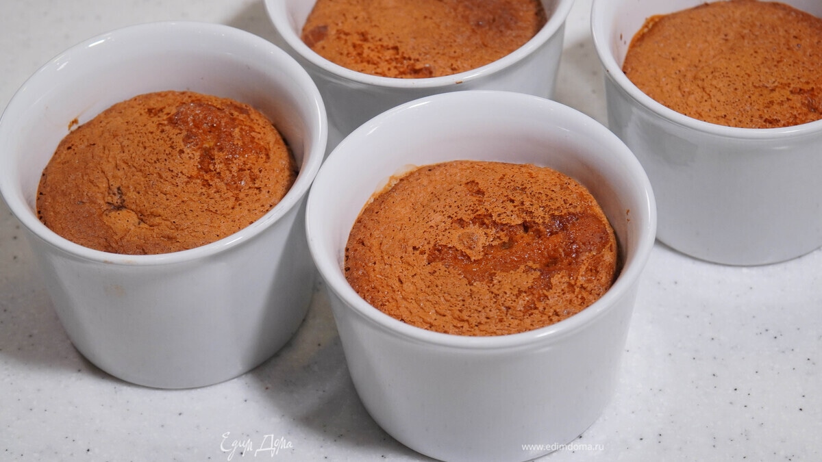 Керамические формочки смазать растительным маслом, дно присыпать коричневым сахаром, разложить в них нарезанные персики и залить тестом. - Шаг 6