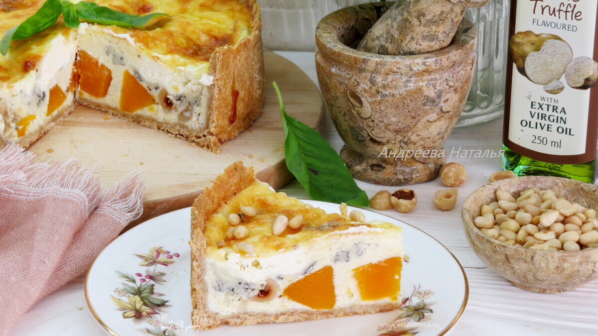 Вкуснейший пирог: хрустящая основа, запеченные тыква и фундук чудесно сочетаются со сливочно-сырной начинкой. Ингредиенты — на форму 18 см.