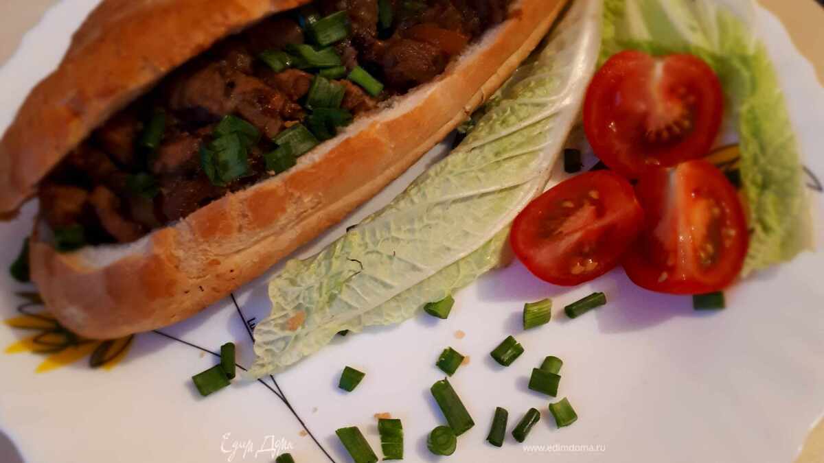 Наполняем багеты мясом и запекаем в духовке около 10–15 минут, при подаче посыпаем зеленым луком)