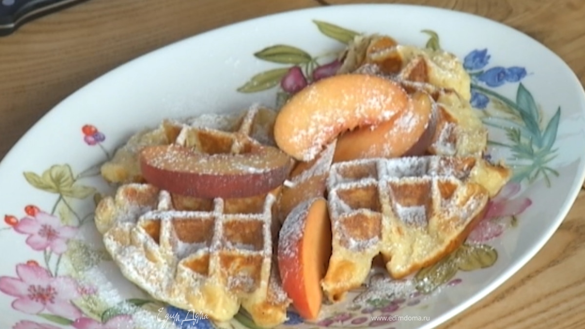 Готовые вафли подавать с персиками, присыпав сахарной пудрой и украсив йогуртом.