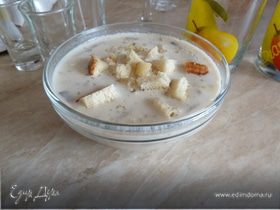 Тем временем нарезаем кубиками батон и обжариваем. Обед готов! Подаем суп с сухариками. Угощайтесь!