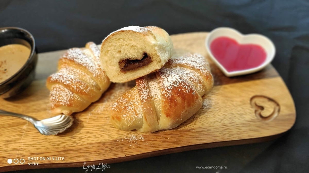 Выложить 1 ст. л. нутеллы в основание треугольника, затем свернуть со стороны заполнения в форме полумесяца. Выложить булочки-рогалики на два противня, выстланных бумагой для выпечки, накрыть промасленной пленкой и оставить еще на 30 минут в теплом месте для отдыха. - Шаг 5