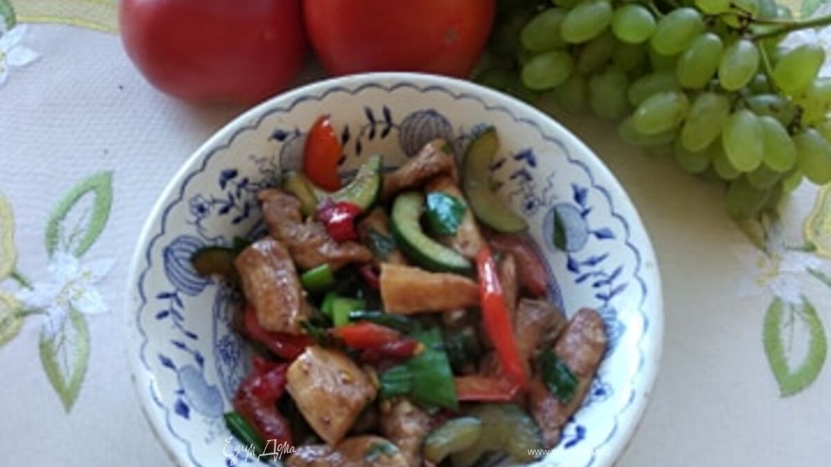 Хорошенько разогреть сковороду (лучше вок, но можно сделать и на обычной) с растительным маслом. Выложить курицу прямо с маринадом. Обжаривать на сильном огне минут 5. Выложить в тарелку. В сковороду добавить масло, выложить болгарский перец и обжаривать 3 минуты, слегка отжать огурцы, избавив их от лишней влаги. Выложить огурцы к перцу. Обжаривать 2 минуты. В сковороду переложить курицу и зеленый лук. Обжарьте еще 2–3 минуты. Наше блюдо готово. Можно подать с рисом или лапшой. Приятного аппетита!