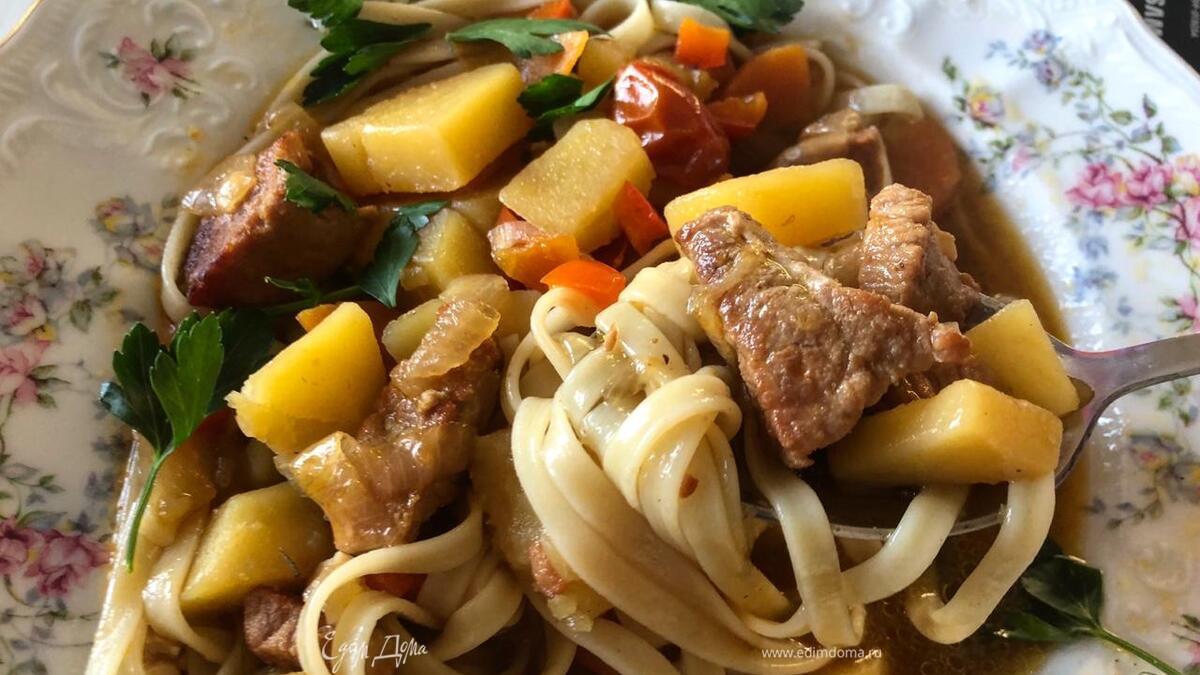 Заливаем 1,5 л воды, добавляем лавровый лист и душистый перец горошком (2–4 шт.), после закипания убавляем огонь, томим до готовности мяса. - Шаг 12