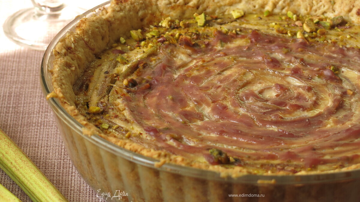 Лето — время пирогов с разнообразными начинками. Представляю вашему вниманию пирог на песочном миндальном тесте с начинкой из рикотты и ревеня. Ревень дает приятную кислинку и аромат, а тонкий слой орехового хрустящего теста дополняет и оттеняет мягкость творожной начинки. Летние пироги — арена для творчества, так из ревеня можно сделать необычную и красиво оформленную начинку в виде решеток, роз, геометрии. Я выбрала спираль-розу. К сожалению, у меня зеленый ревень, у него более грубые стебли. Эффектнее готовить с красным ревенем!