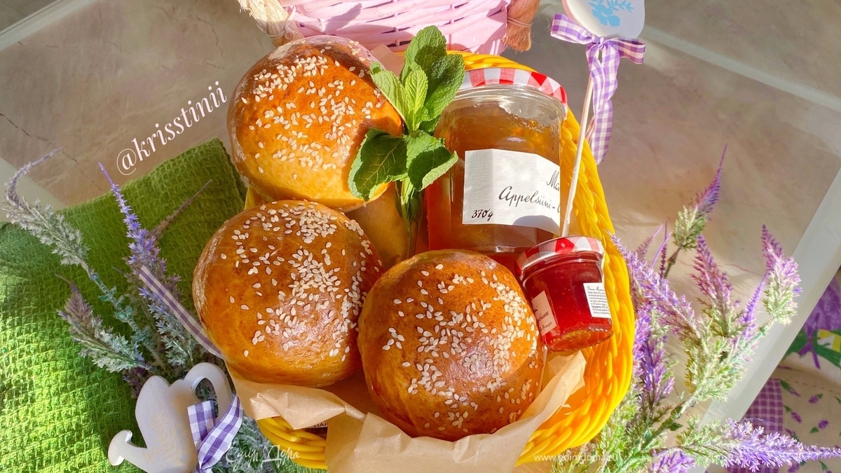 Поделить тесто на шесть равных частей (лучше на весах) и сформировать булочки. Выложить на противень, накрыть пленкой и расстаивать в духовке при 35–40°C примерно 25–35 минут. Они должны увеличиться в два раза. Затем смазать яйцом, посыпать кунжутом и выпекать около 20 минут при 180–190°C, до румяности.