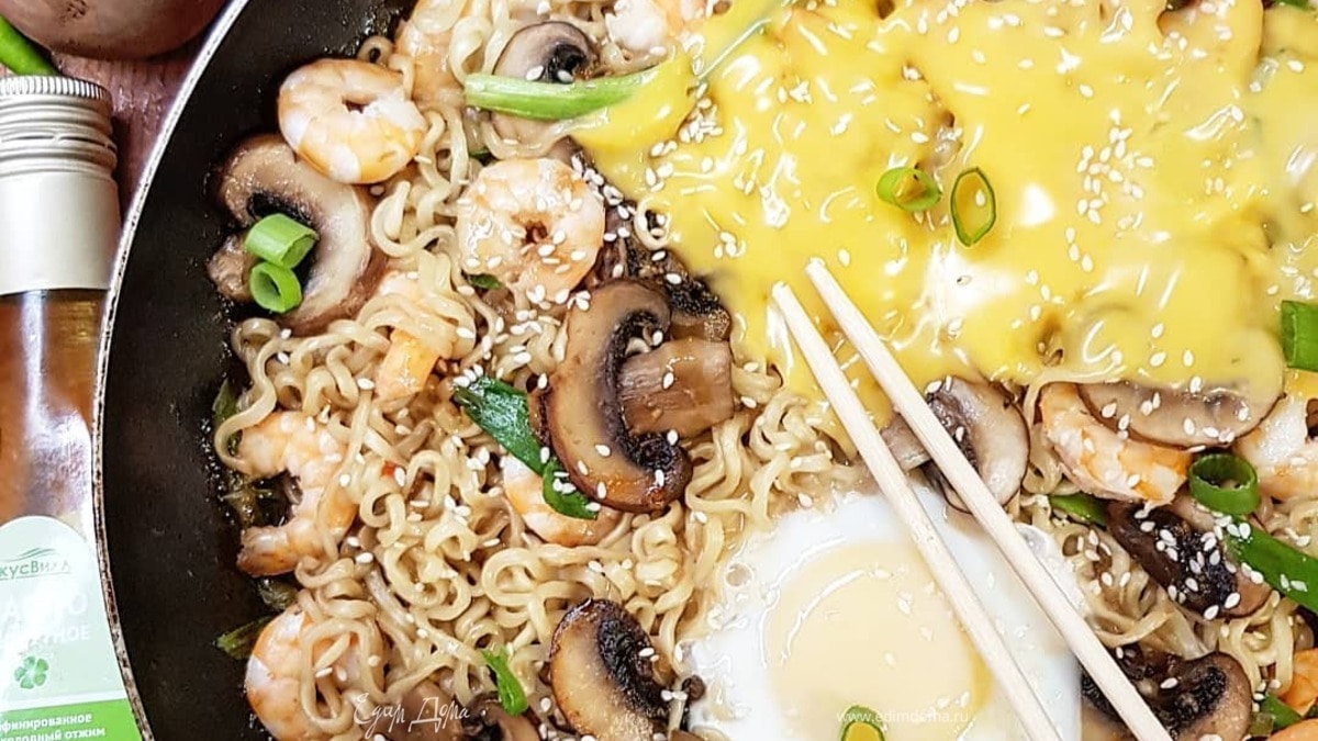 Нарежьте перьями лук. Добавьте его к грибам вместе с креветками. Прожарьте 1,5 минуты. Добавьте рамэн. Перемешайте. Влейте соус. А теперь вкусный секрет, который я подсмотрела у знакомой в сети. Разбейте с одной стороны яйцо, с другой стороны выложите ломтики сыра. Накрой сковороду крышкой и протушите блюдо 3 минуты. - Шаг 4