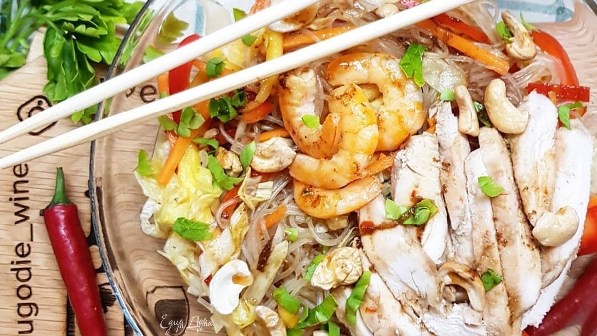 Тайский салат с фунчозой, курицей и манго