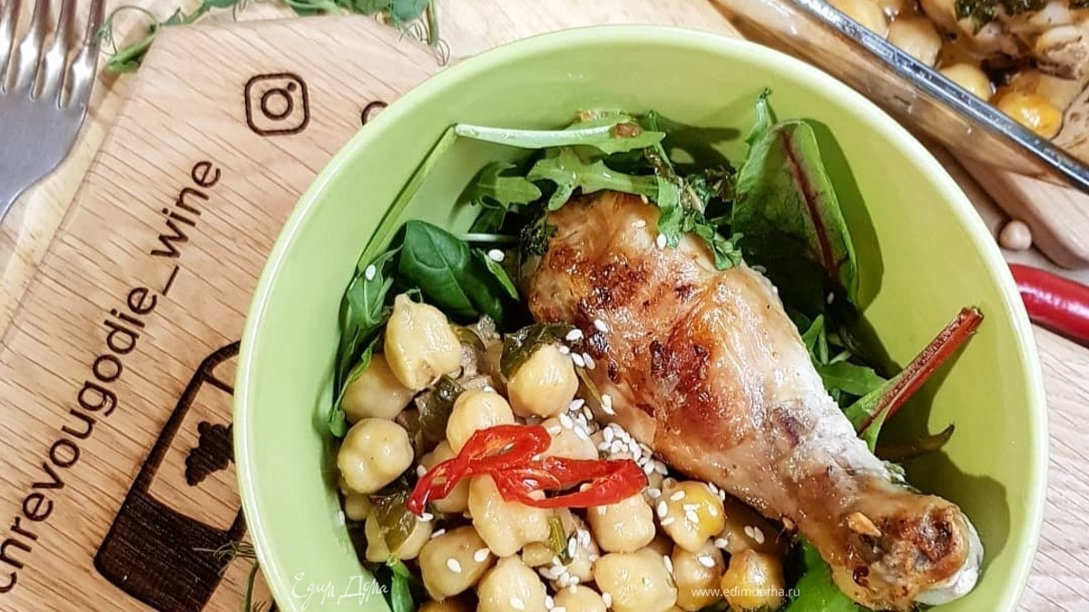 Затем добавьте в сковороду нут. У меня был консервированный, но если есть обычный — то же самое. Нужно только его предварительно замочить на ночь и проварить минут 30. - Шаг 3
