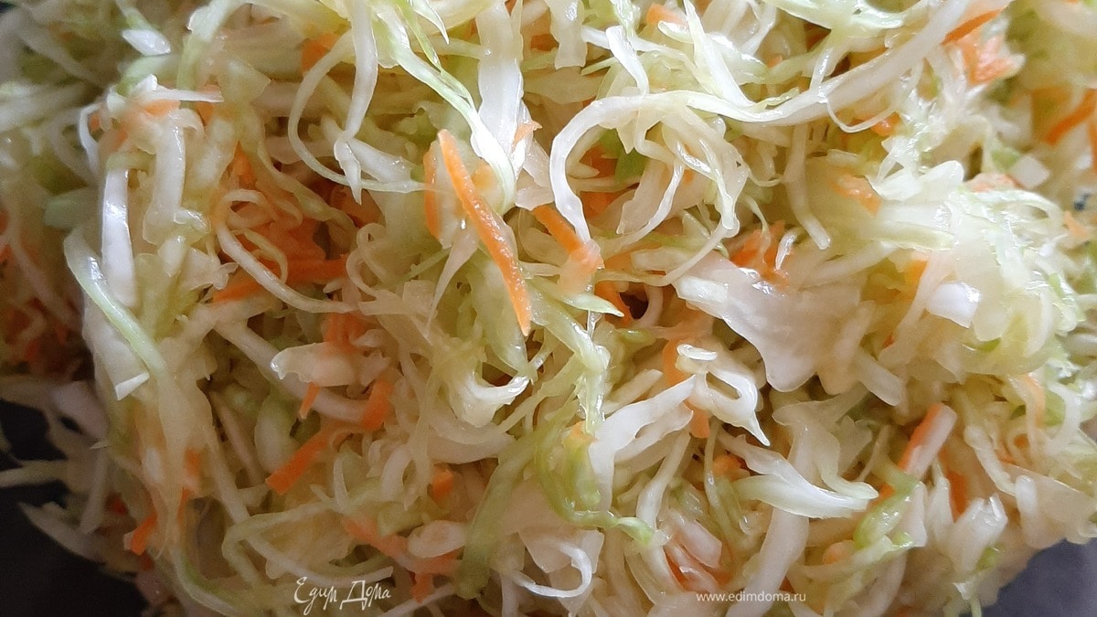 Капусту шинкуем как можно мельче, солим и мнем так, будто месим тесто, пока капуста не станет мягкой и не перестанет держать форму. - Шаг 2Лук нарезаем полукольцами и заливаем кипятком на несколько минут, чтобы убрать горечь, в это время натираем морковь на мелкой терке. Добавляем к капусте лук и морковь, а также немного сахара (можно начать с чайной ложки, а потом добавлять при необходимости), масло и уксус, зелень по вкусу.