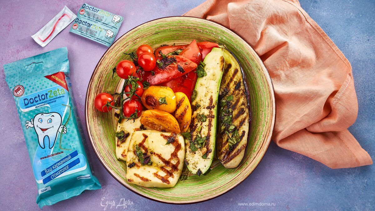 Обжарьте овощи и сыр халуми на сковороде-гриль с двух сторон до золотистости. - Шаг 5
