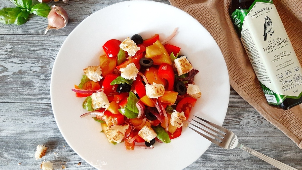 На блюдо выкладываем все овощи, листья базилика, поливаем заправкой, солим по вкусу и сверху выкладываем сухарики. Приятного аппетита!