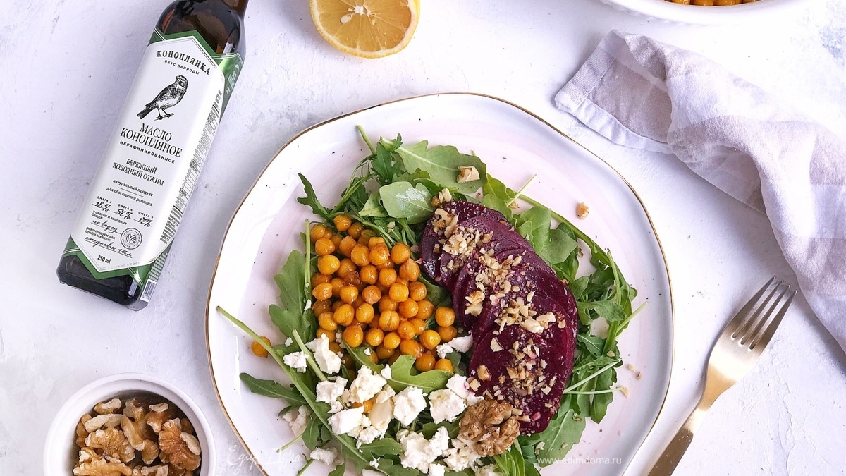 Легкий, но в то же время сытный и питательный салат за счет сыра и большого содержания растительного белка в нуте. Плюс дополненный полезными жирами в виде орехов и конопляного масла. Поэтому такой салат можно использовать в качестве полноценного блюда.