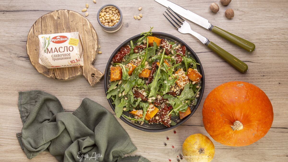 Теплый салат с киноа, запеченной тыквой и вялеными томатами