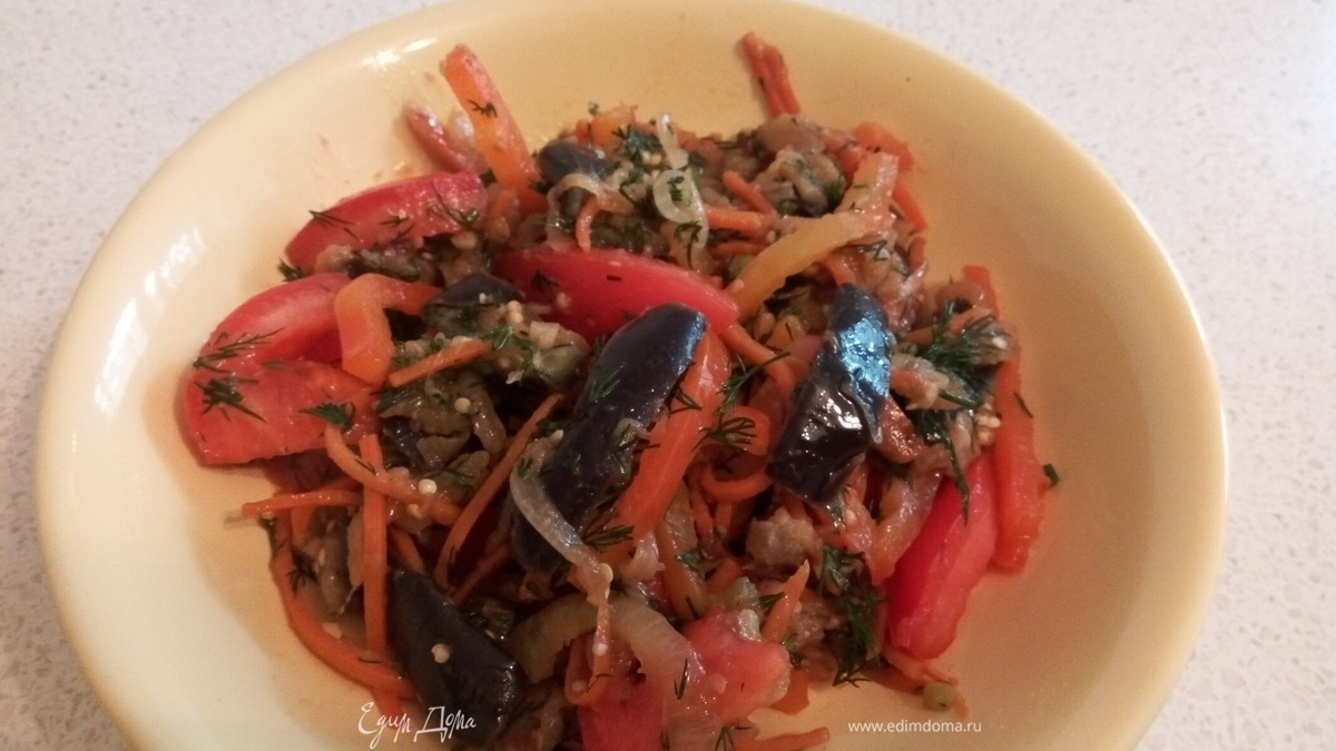 Вкусный салат с баклажанами, простой состав, легкое и быстрое приготовление. Его можно употреблять как в теплом, так и в холодном виде. Очень вкусное