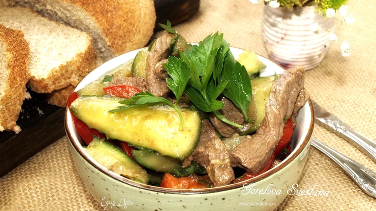 Огурцы промыть, удалить плодоножки и разрезать на две части поперек. Разрезать каждую часть вдоль и нарезать брусочками. Складываем подготовленные огурцы в миску, добавляем 1 ч. л. соли. Отставить, пока готовится говядина. - Шаг 2