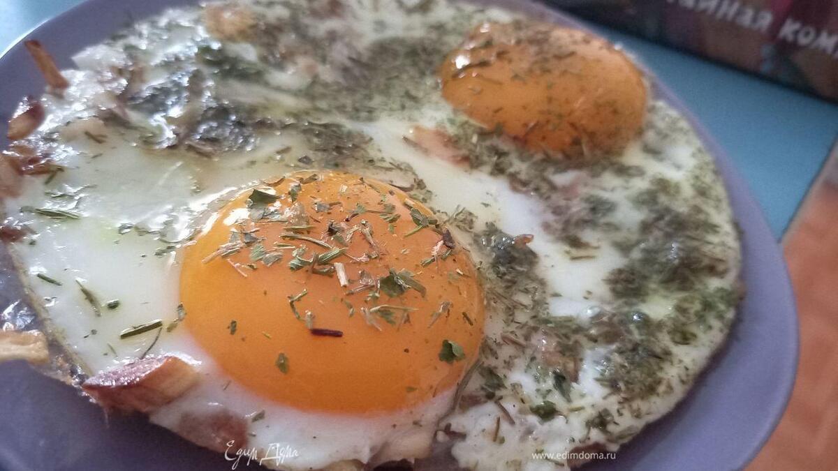Тут же всыпать сушеные травы, стараясь сильно не засыпать желток. Если травы не нравятся, просто пропустите этот шаг. Закрыть крышкой на две минуты, готовить на среднем огне, чтобы схватился белок и сушеные травы немного смягчились. - Шаг 7