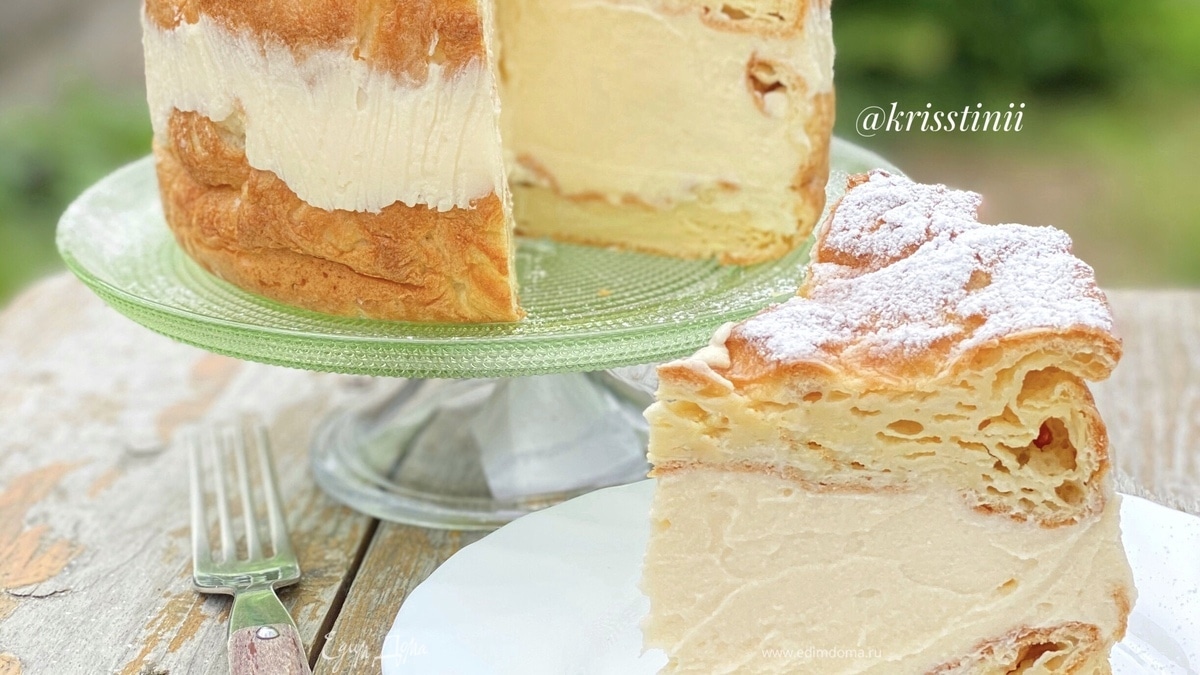 Невероятно нежный заварной торт, который можно сравнить с большим эклером. Крем напоминает по вкусу сливочный пломбир.