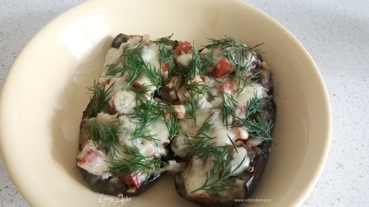 Баклажаны размещаем близко друг к другу и выкладываем всю начинку. Получится большая горка, но она осядет в процессе запекания.