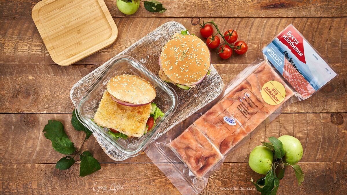 Сытный домашний бургер с котлетой из лосося можно взять на работу в качестве полноценного обеда.
