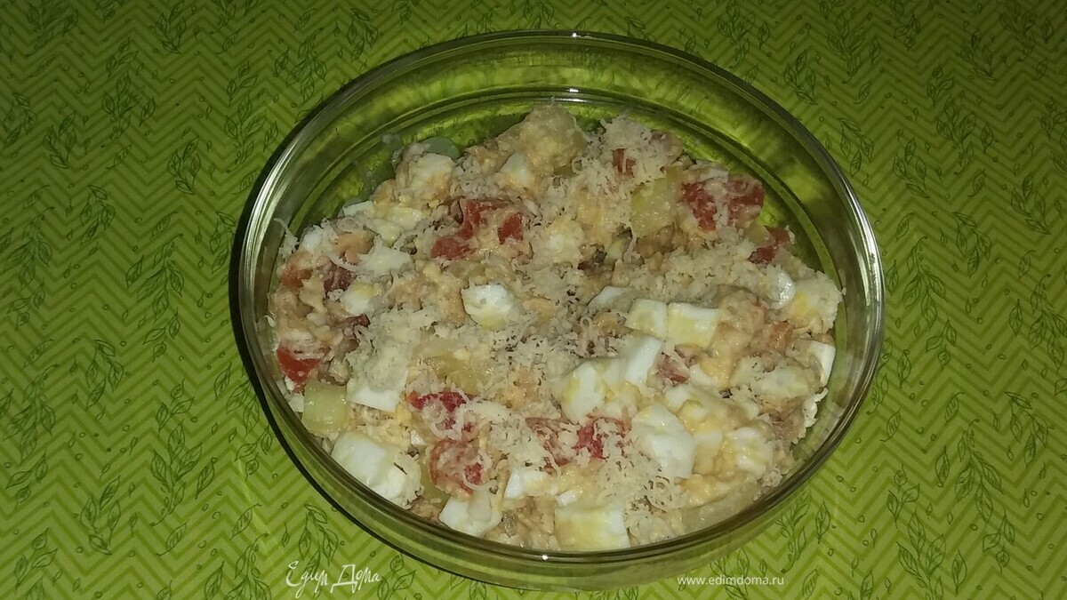 Посыпать тертым сыром. Затем поставить салат в холодильник на 30 минут. Блюдо готово. Приятного аппетита!