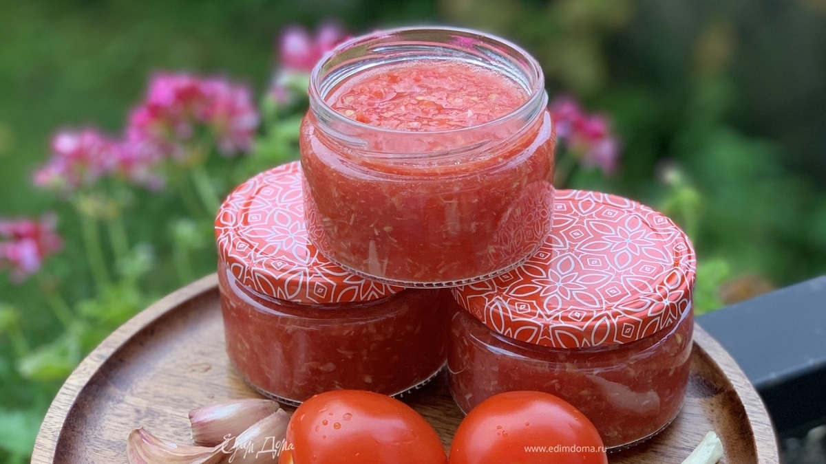 Моем помидоры, удаляем плодоножки, нарезаем на четыре части. - Шаг 2Чистим хрен и чеснок. Пропускаем все через мясорубку. Солим, разливаем по банкам.