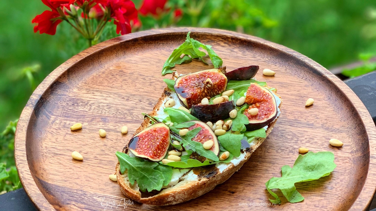 - Шаг 2Выкладываем руколу, нарезанный инжир, посыпаем кедровыми орешками и добавляем пару капель бальзамического соуса.
