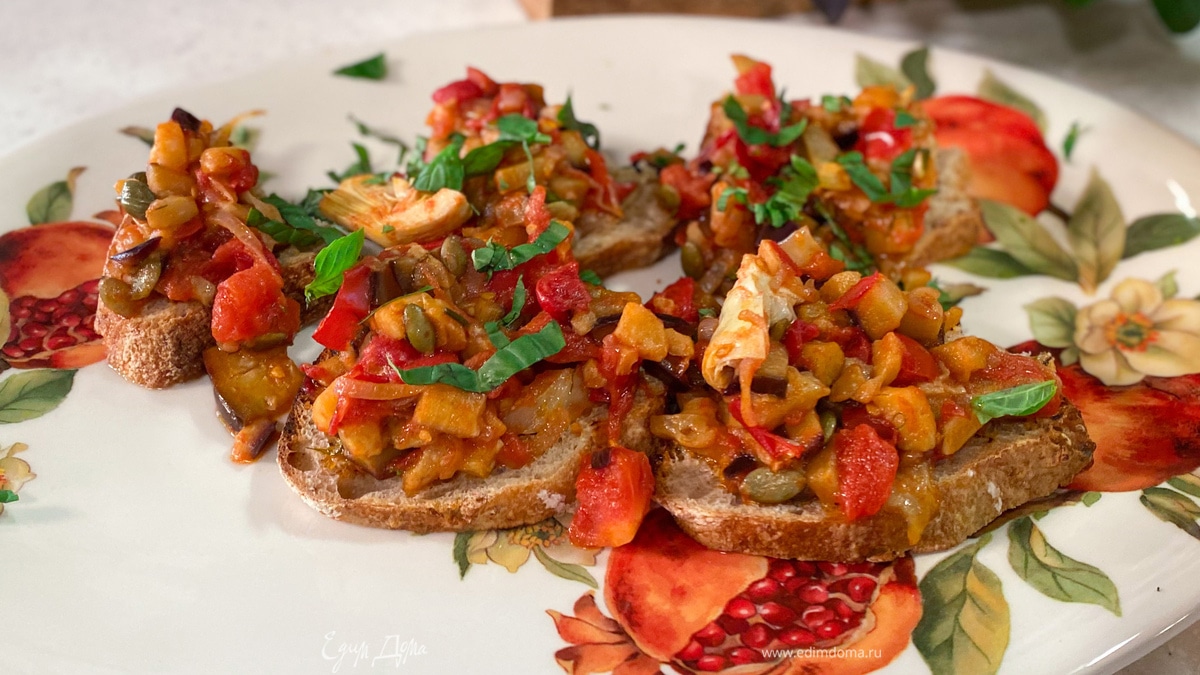 Капоната — традиционное сицилийское блюдо, это баклажаны, тушенные с другими овощами, а мы сегодня сделаем с капонатой кростини, то есть будем подавать капонату на подсушенном хлебе! Не любите каперсы — замените их оливками.