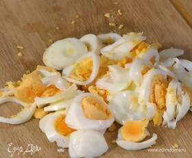 Яйца отварить вкрутую, затем почистить и нарезать кружками.
