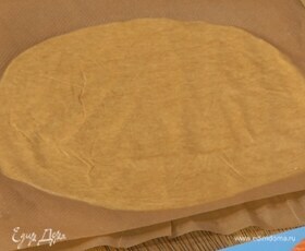 Охлажденное тесто разрезать пополам и раскатать между листами для выпечки в тонкие пласты.