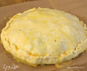 Выпекать кулебяку в разогретой духовке 35–40 минут до появления золотистой корочки, затем переложить на решетку и остудить.