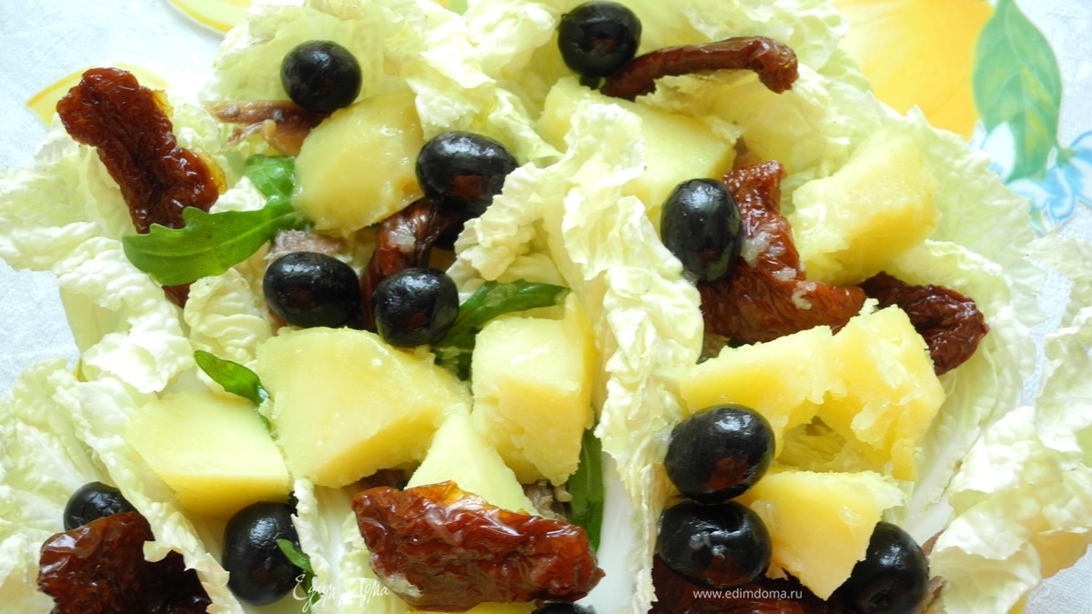 Сверху выложить кусочки вареного картофеля и оливки. Полить все смесью оливкового масла и лимонного сока.