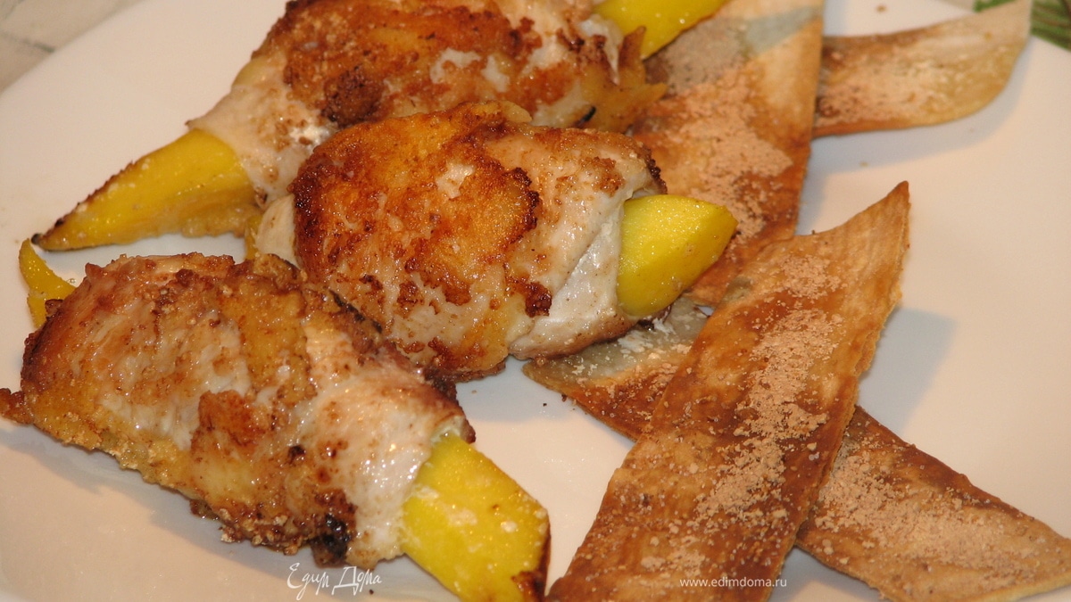 - Шаг 1Филе курицы режем на тонкие кусочки, отбиваем, взбрызгиваем оливковым маслом, солим, посыпаем обильно пармезаном (крошкой). Тем временем очищаем манго и режем в длину полосачками. На куриное филе кладем кусочек манго. Заворачиваем в трубочку, обваливаем в крупно натертом пармезане, затем в панировочных сухарях. Обжариваем наши трубочки на оливковом масле до золотистой корочки. Тем временем, режем на длинные полосы наш лаваш, натираем слегка чесноком (можно заменить чесночной солью(которая продается в виде приправы), взбрызгиваем оливковым маслом, обильно посыпаем сыром. запекаем до готовности в течение 5-7 минут.
