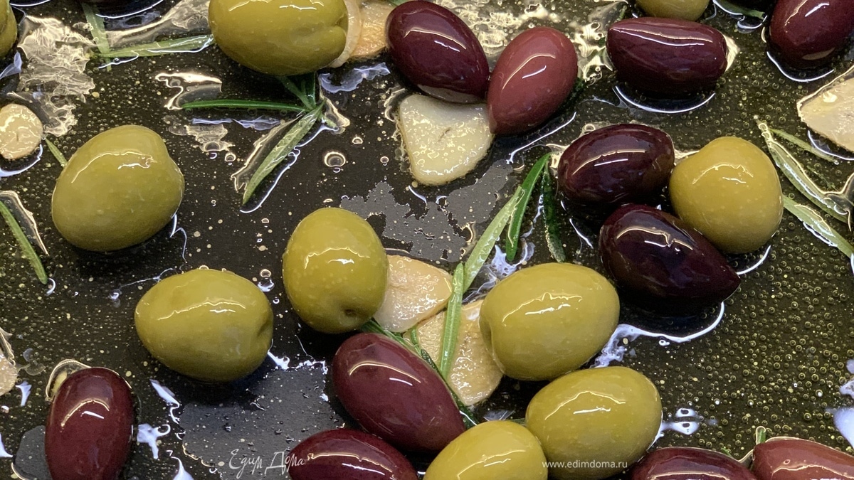 - Шаг 2Обжариваем чеснок и розмарин, добавляем оливки, предварительно слив с них жидкость.