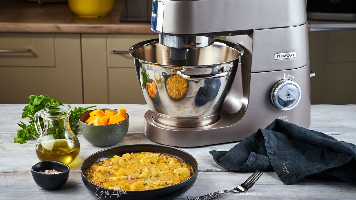 На кухонную машину Kenwood установите насадку для нарезки кубиками. И с ее помощью нарежьте тыкву.