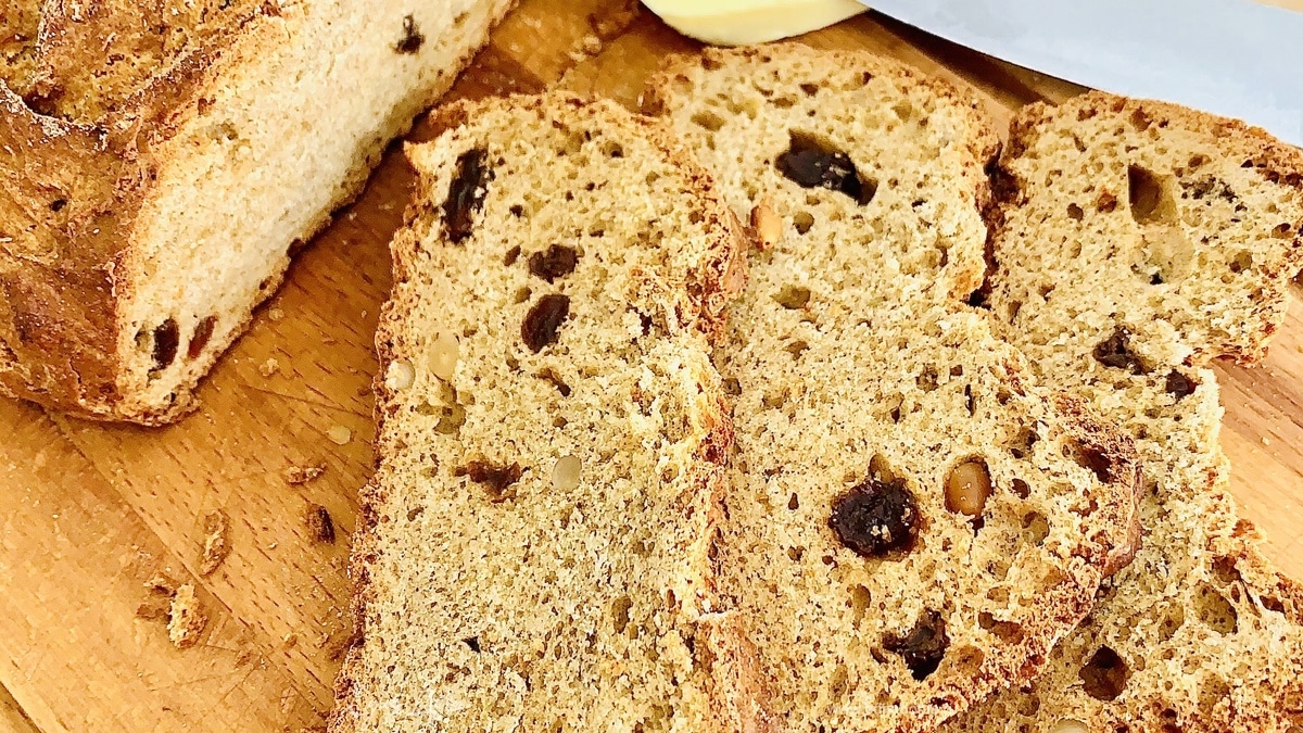 Цельнозерновой хлеб без дрожжей и замеса. По желанию в тесто можно добавлять сухофрукты, орешки, семечки, оливки, травы, вяленые помидоры.