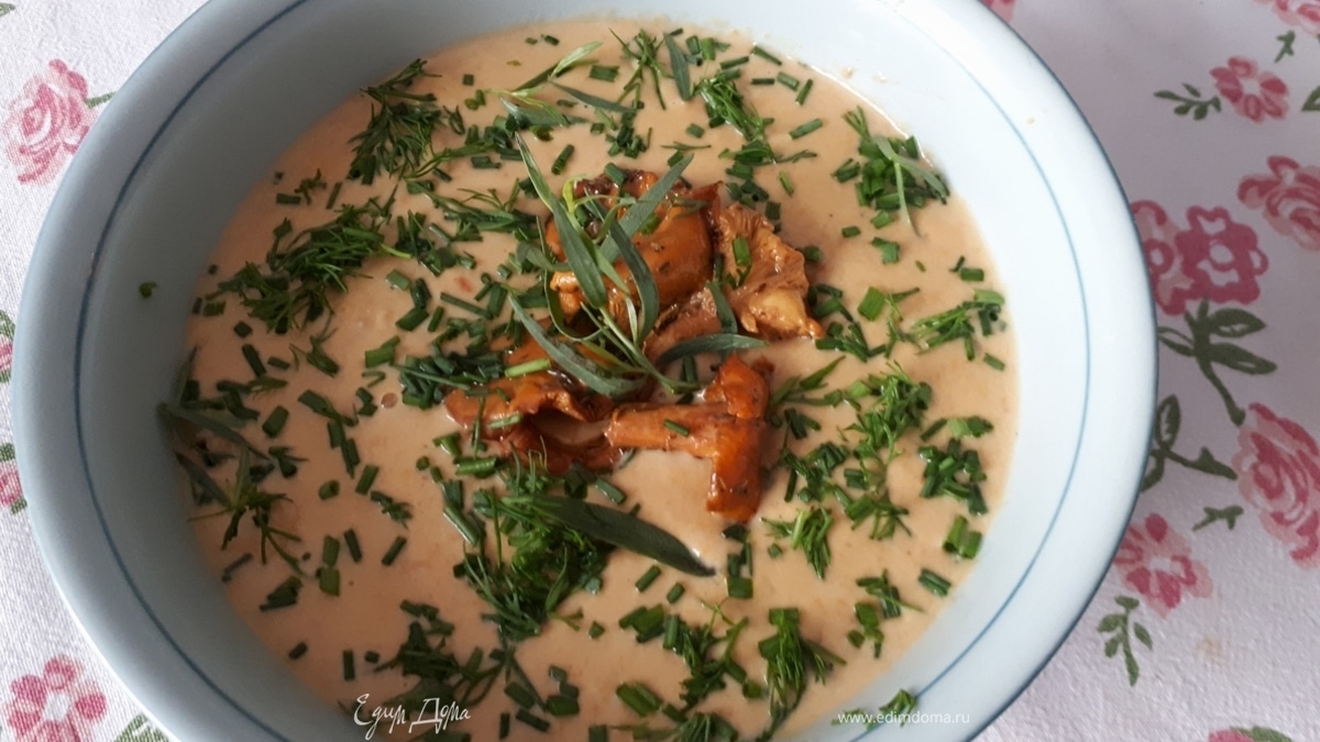 Для подачи положите целые лисички сверху на велюте и посыпьте травами.
