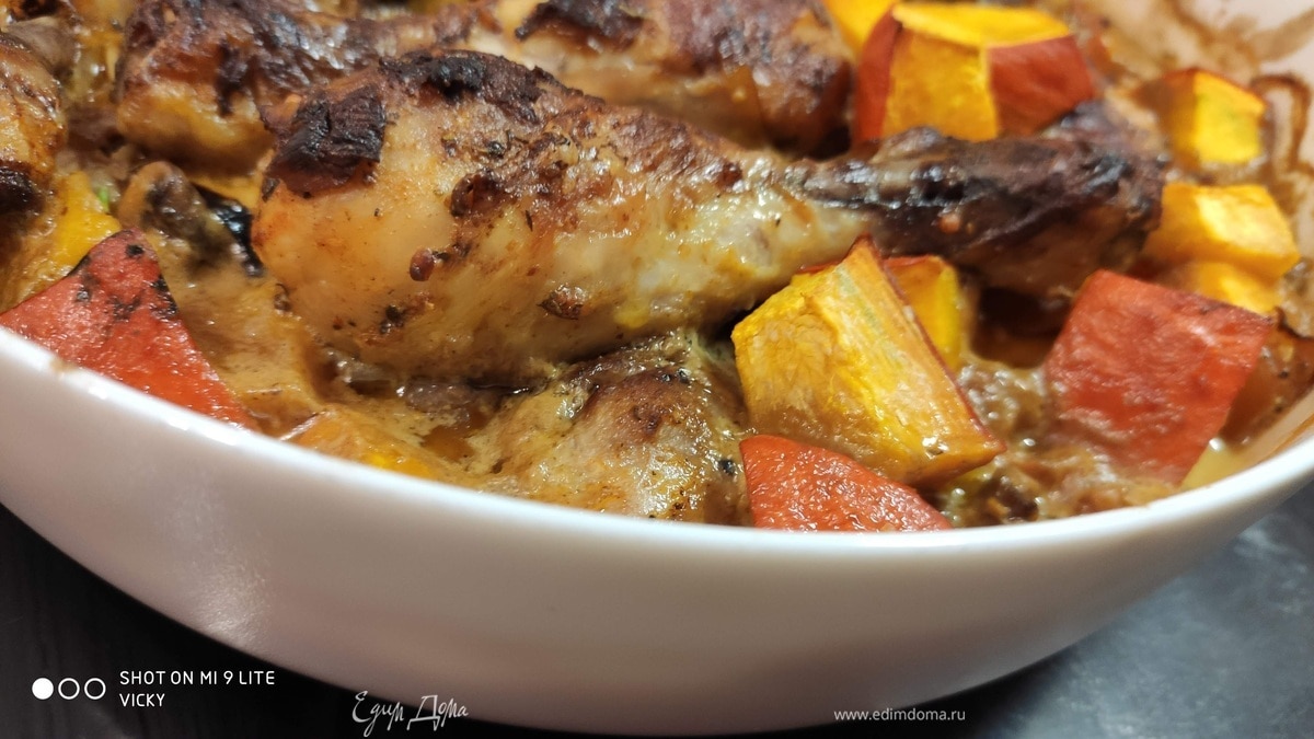 Выложить смесь в большую форму для запекания, сверху разложить курицу и кусочки тыквы. Запекать в духовке 30–40 минут при 180°C. Проверить очень просто — ножом прокалываете самую толстую часть голени. Если сок прозрачный, значит, курица готова. - Шаг 5