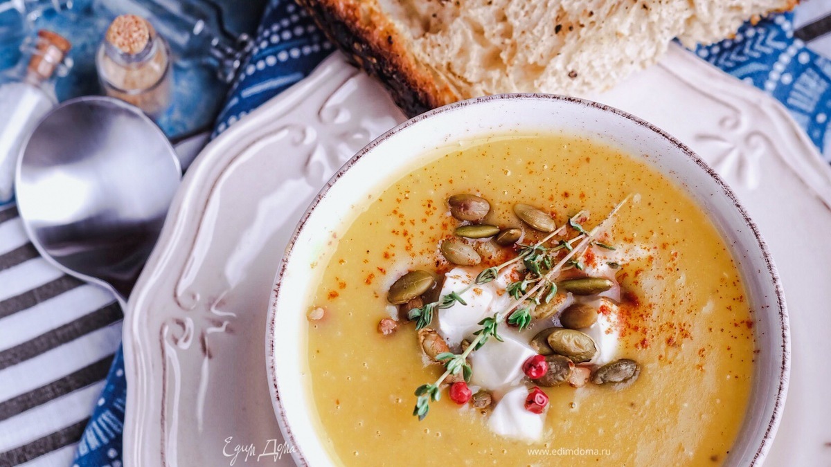 Прекрасный вариант осенних супов — согревающий тыквенный суп-пюре. В данном случае предлагаю не совсем обычный вариант — со свежим имбирем. А чечевица придаст супу насыщенности и пользы.