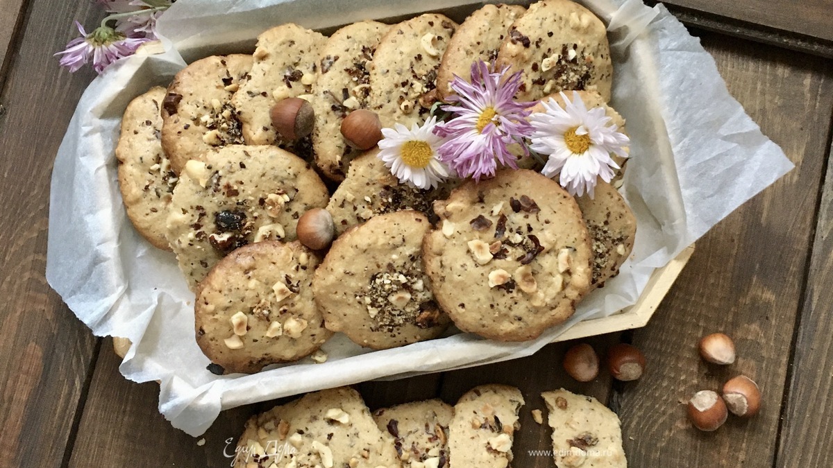 Рассыпчатое песочное печенье с орешками и шоколадом. Орехи можно брать любые, какие нравятся.