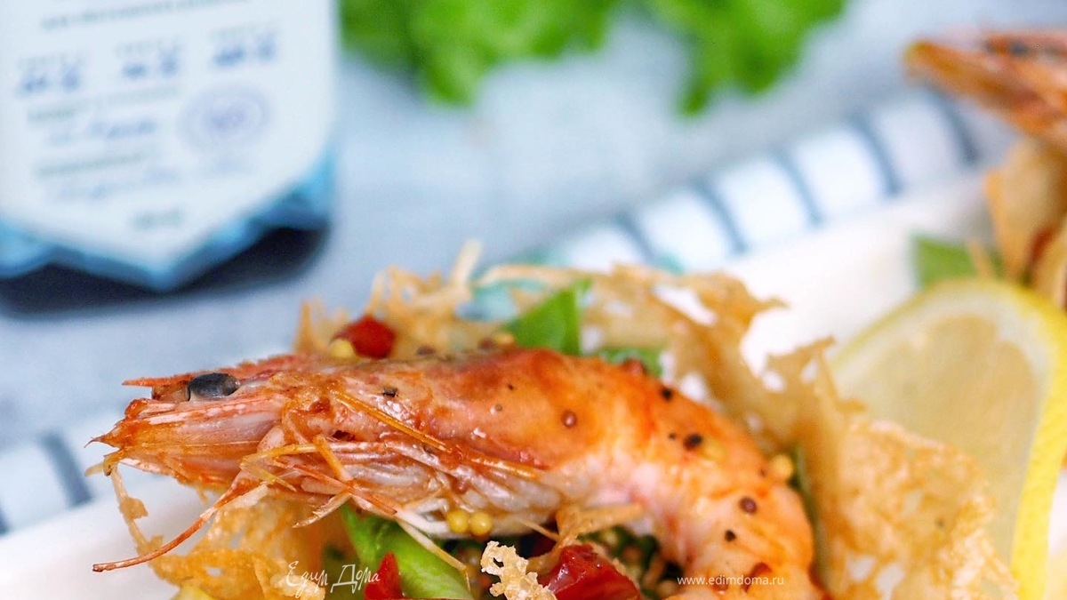 у меня фриллис сегодня) промыть, просушить и мелко нарезать или руками порвать, добавить заправку и перемешать. Вяленые томаты нарезать тонкими дольками. Собираем корзиночки: нижний слой — салат с заправкой, сверху — креветки и дольки помидоров. Если осталась заправка, можно сверху чуть полить. Подавать сразу, пока корзиночки хрустящие. Чтобы салат был более хрустящим, не нарезайте его слишком мелко. Подавайте корзиночки сразу после сборки, чтобы они не потеряли хрусткость.