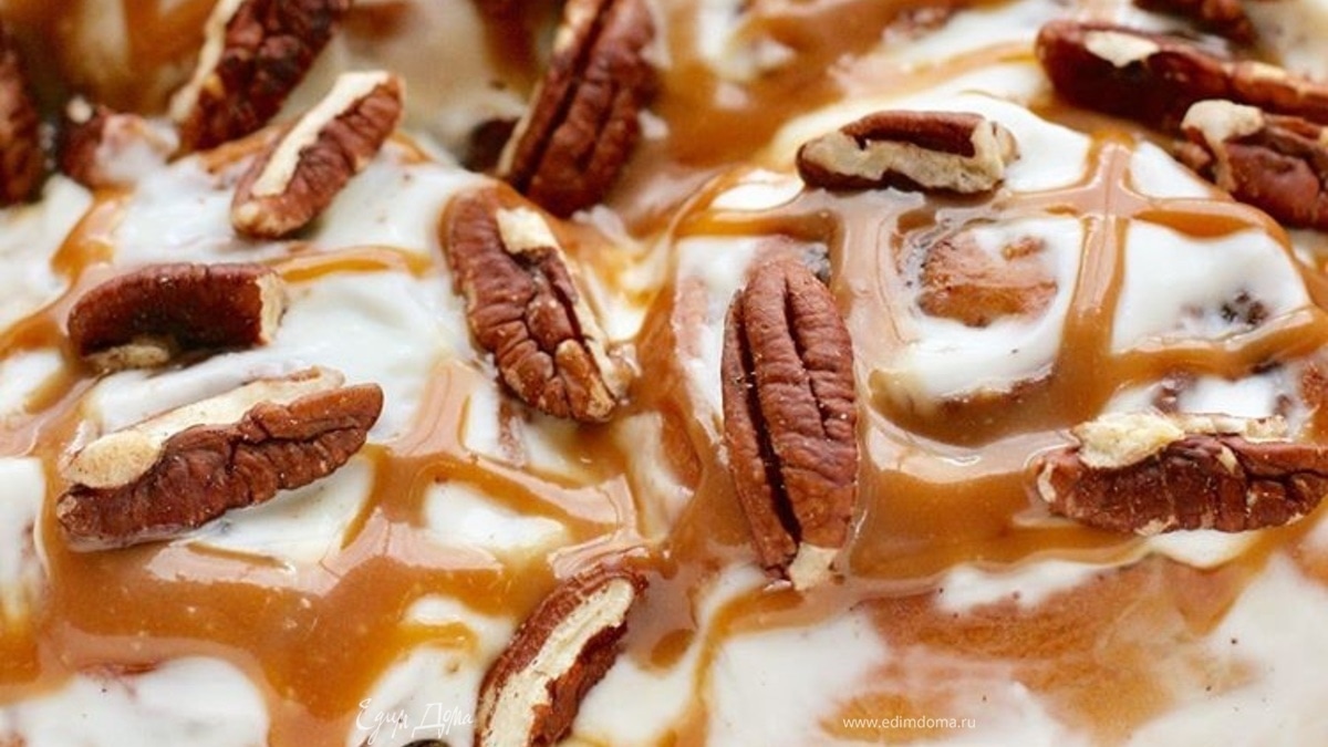 - Шаг 3Даем немного остыть и смазываем их маскарпоне с сахарной пудрой. При желании поливаем карамелью и посыпаем орехом пекан.